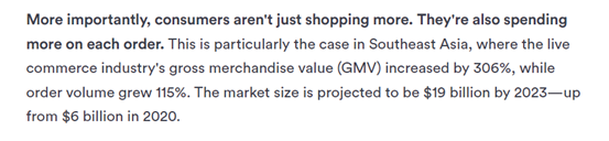 但直播电商的火爆不止在越南,整个东南亚地区都在复制中国的直播电商模式,并且已初见成效。泰国在线网关 Omise 6 月的公开数据显示,东南亚直播电商行业的 GMV(商品交易总额)年增长率达 306%,订单量一年增长了 115%。Omise 预测,到 2023 年,东南亚直播电商市场规模将达到 190 亿美元。