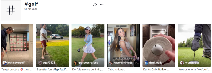 “#golf”标签在 TikTok 上拥有 375 亿次观看,添加该标签的视频内容大致分为:击打高尔夫球、高尔夫球趣味玩法、高尔夫球练习、高尔夫进球技能分享等四大类。
