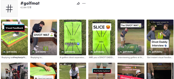 通过在 TikTok 上搜索,发现“#golfmat”话题的观看次数达 4280 万,带有该话题且播放量靠前的视频均为“@golf.daddy”的账号发布。