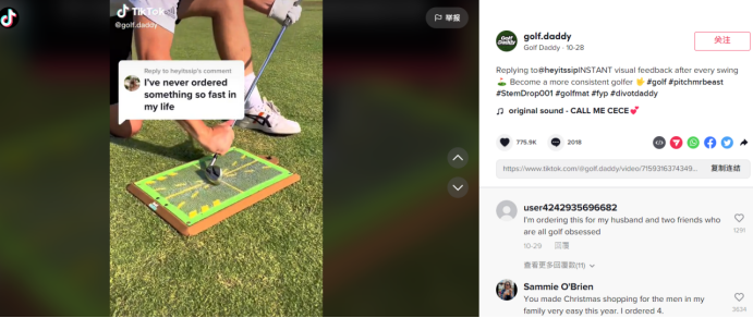10 月 28 日,@golf.daddy 发布的视频拥有 2740 万曝光量,该视频为购买该球垫用户反馈视频,主题为“成为挥杆更稳定的高尔夫球手”,用户的反馈视频从消费者角度出发,展现该款球垫对于提升挥球技术的帮助,增强产品的信任性和购买力度。该视频评论区中,有用户表示家人、朋友都购买过这款球垫,还有人表示这让节日礼物变得很容易。