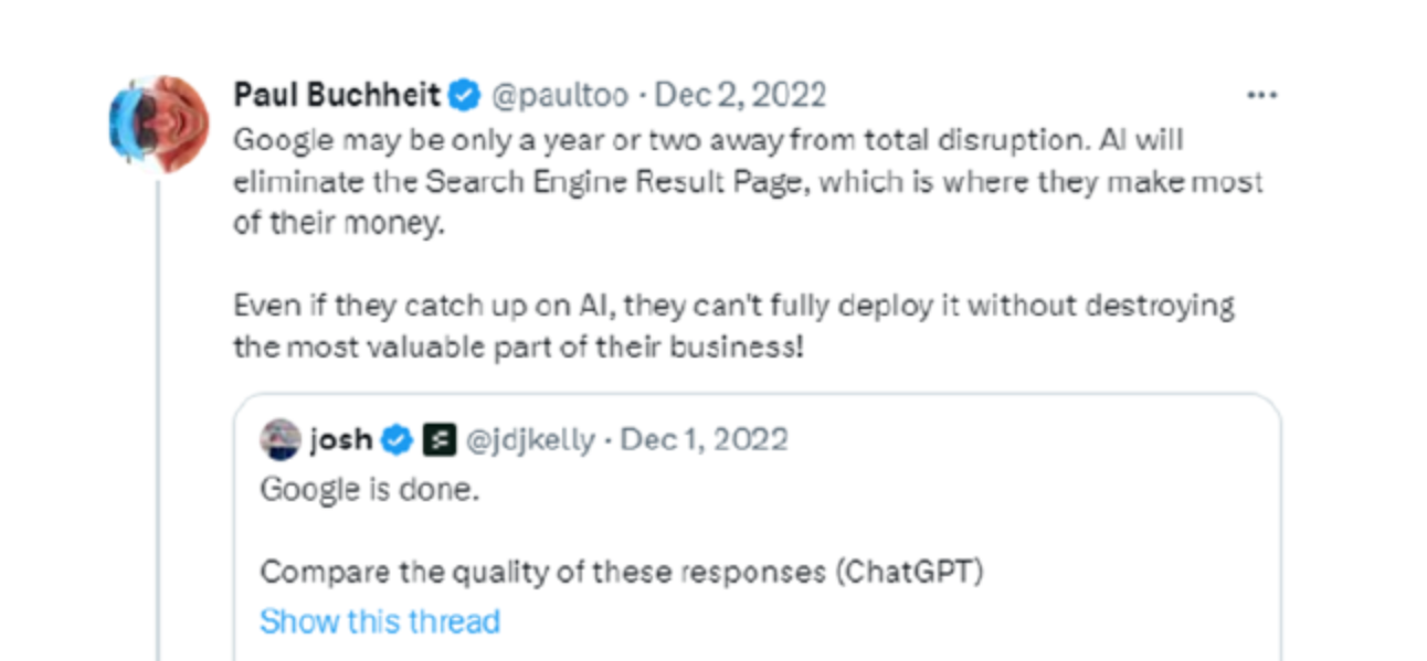 Gmail 的缔造者保罗•布赫海特(Paul Buchheit)在社交媒体上发文,表达了对谷歌有可能被 ChatGPT 之类的聊天机器人取代的担忧。