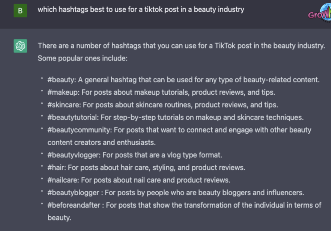 我们想知道 ChatGPT 是否可以用来选择正确的主题标签,我们试用了该机器人后发现效果相当不错。我们向 ChatGPT 询问与美容行业相关视频的主题标签建议,ChatGPT 不仅给出了相当长的建议列表,而且还详细说明了每个选择,解释了哪个主题标签最适合特定类型的视频。它甚至给出了一些关于如何正确使用主题标签的建议。