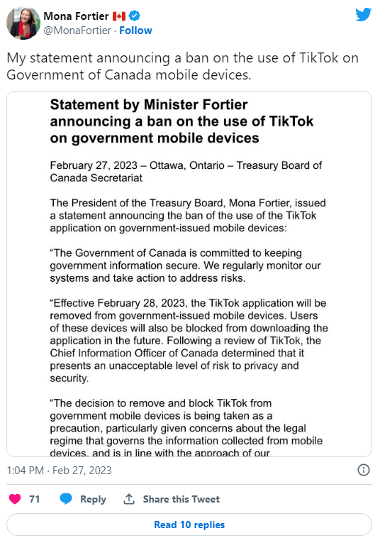 据悉,当地时间 2 月 27 日,加拿大政府以“该程序对隐私和安全构成不可接受的风险”为由,宣布自 2 月 28 日起,禁止在政府部门使用的移动设备上使用 TikTok,此外,这些设备的使用者也不得下载该应用程序。
